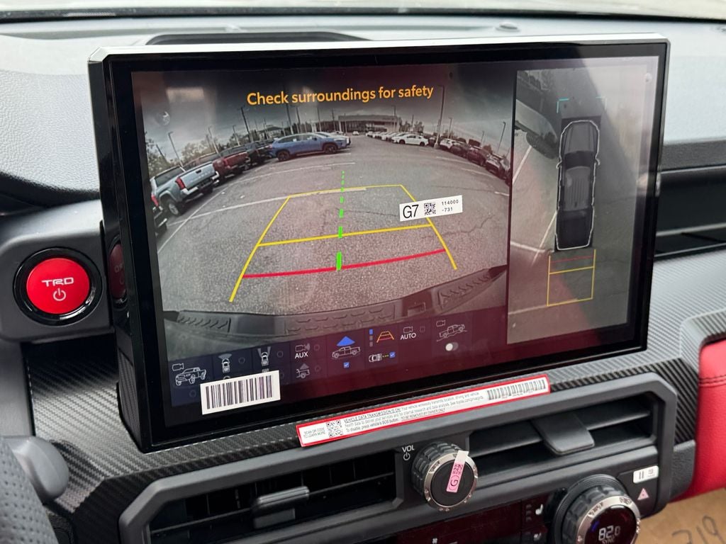 - TRD Pro leather-trimmed manual tilt/telescopic steering wheel with TRD badge, red center stripe, and phone, audio, display/infotainment, and Driver Assist controls